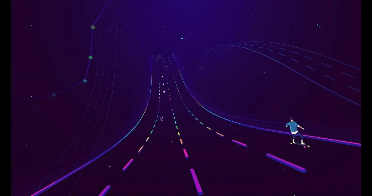 Sayonara Wild Hearts is a dreamy arcade game about riding motorcycles, skateboarding, dance battling, shooting lasers, wielding swords, and breaking hearts at 200 mph.