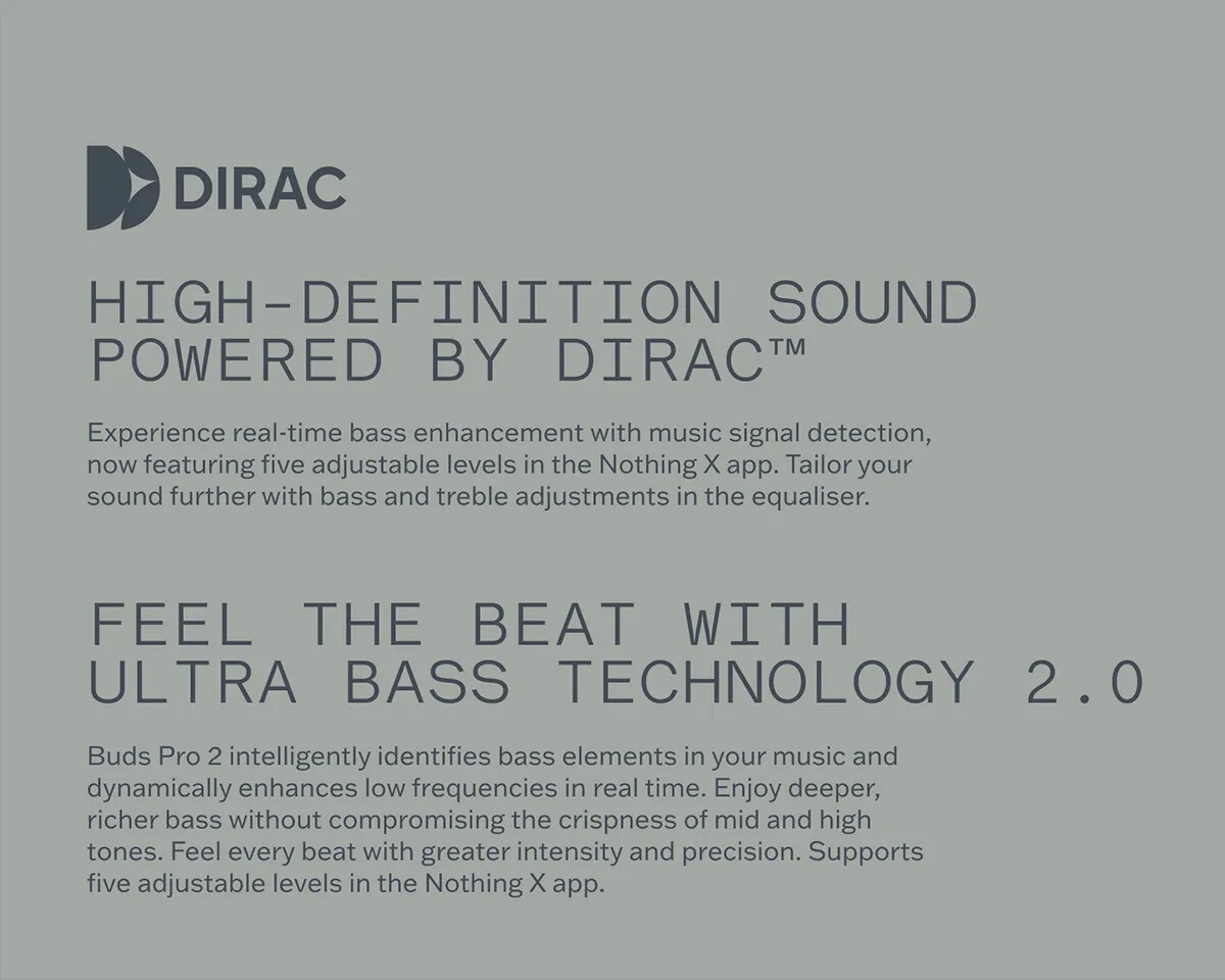 - Ultra Bass Technology 2.0 - Buds Pro 2 intelligently identifies bass elements in your music and dynamically enhances low frequencies in real time. Enjoy deeper, richer bass without compromising the crispness of mid and high tones. Feel every beat with greater intensity and precision. Supports five adjustable levels in the Nothing X app.